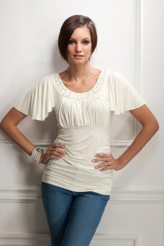 A beautifully ruched bodice gives this blouse such a unique and flattering silhouette. This silky top also has neckline embellishments that make it so stunning with all your jeans and pants. Imported. Faux diamond and pearl embellishments at neckline Ruched bodice; empire seam Viscose/spandex; machine wash Length: hits just below the hips ...