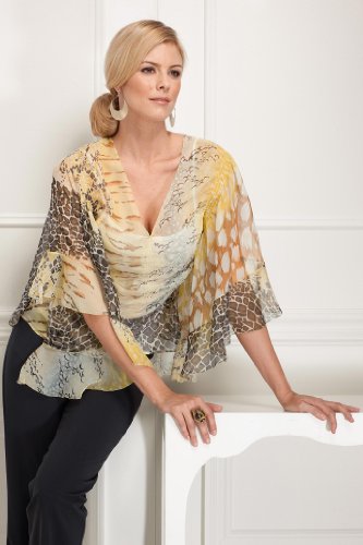 This floaty top is all about the drama! The animal print gives it such a current look! Layer a cami beneath this sheer blouse for such a pretty, feminine look with pants, or even jeans! Imported. Sheer animal-print georgette Dramatic cape sleeves Ruching detail Cami included for coverage Polyester; hand wash Length: hits at the hips ...