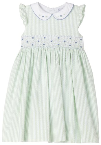 Flutter cap sleeve cotton seersucker dress. Embroidered peter pan collar. Front smocking with embroidered rosettes. Pearlized button back closure with tie back sash.